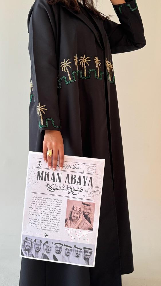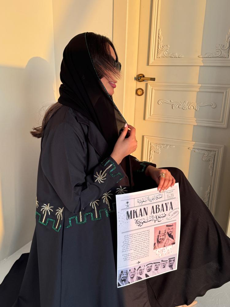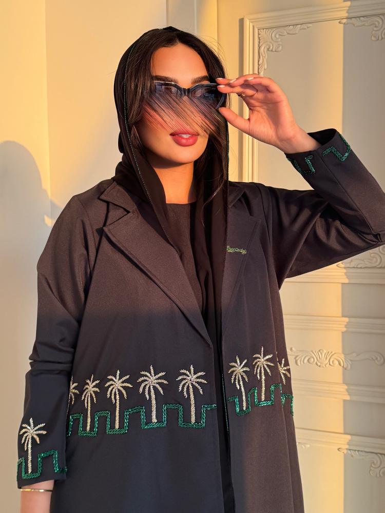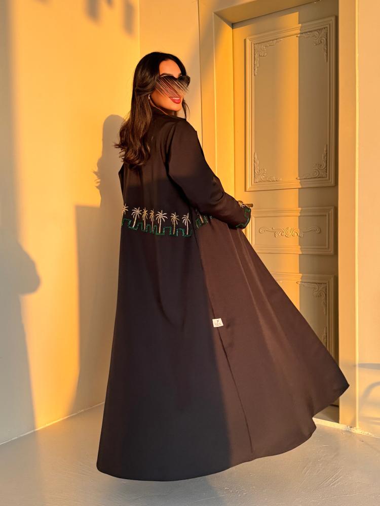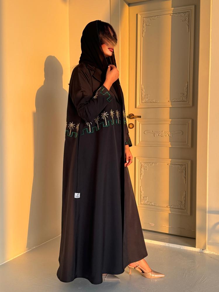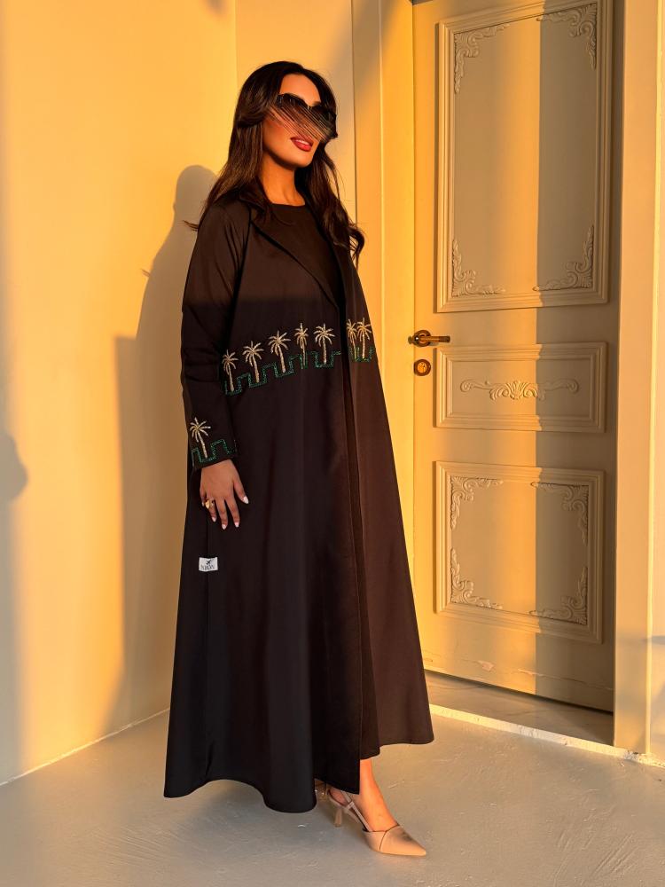 عباية كريب ملكي بقصة بليزر مزينه بشك يدوي ( نخلة ، قلعه ) في الكم ووسط العبايه بالامام والخلف 🌴 مع جيوب مخفيه 😎