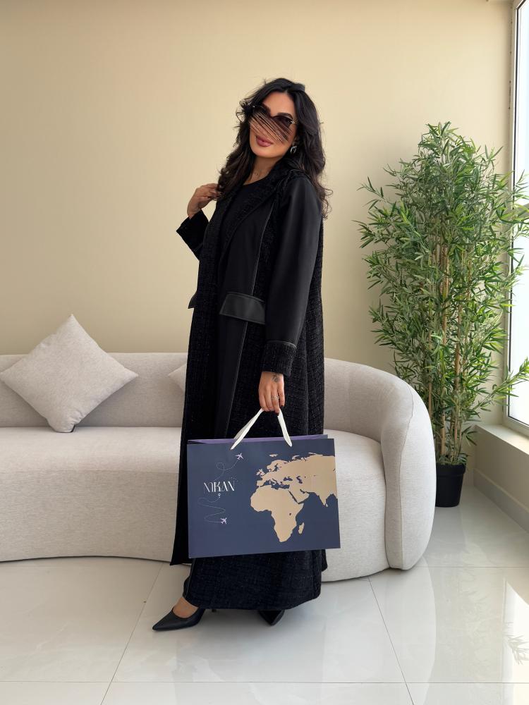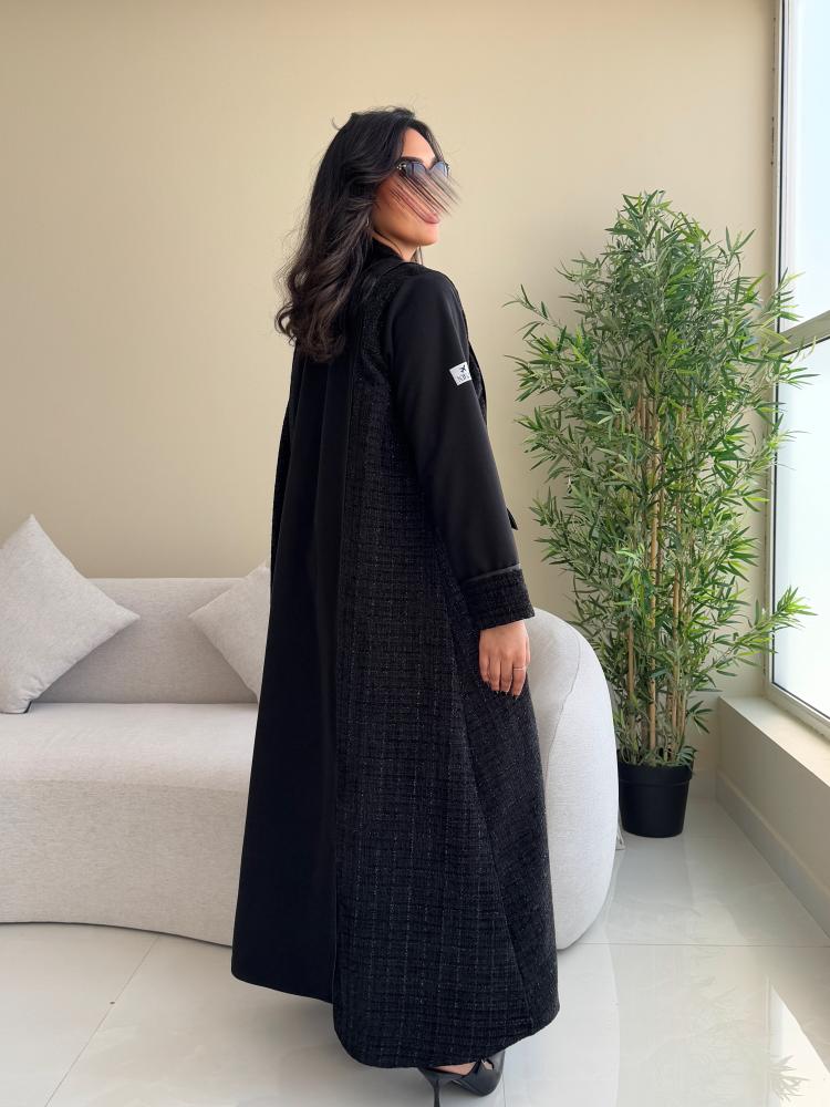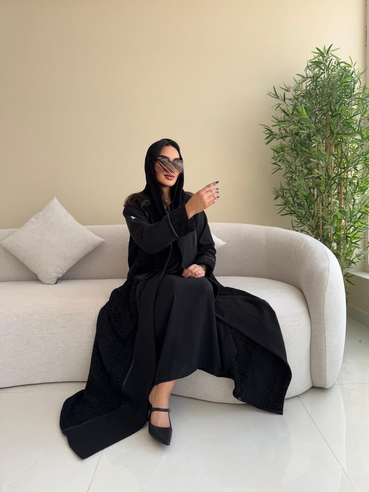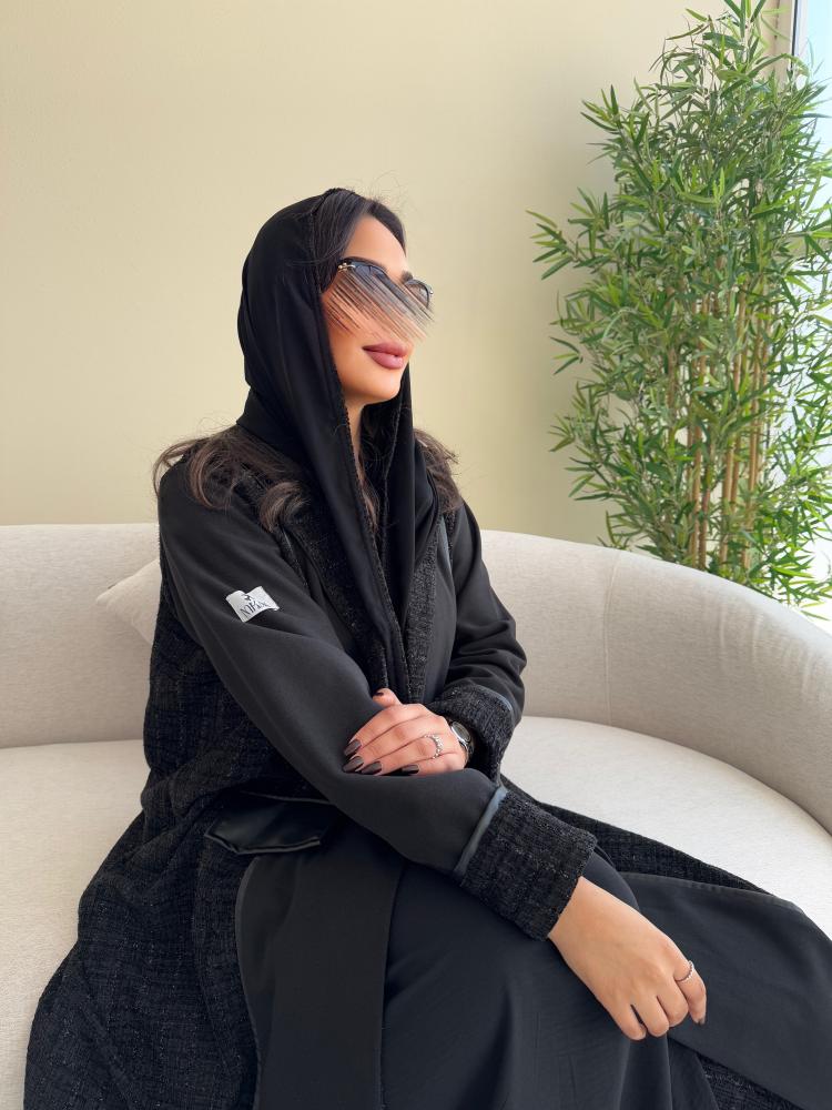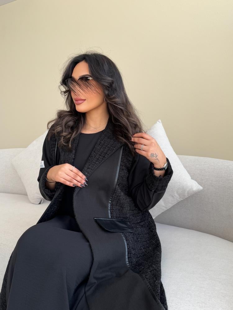 عباية بقصة بليزر نصف كلوش بقماش الجوخ وتطعيم بقماش شانيل من الجوانب والجلد الاسود 🖤
